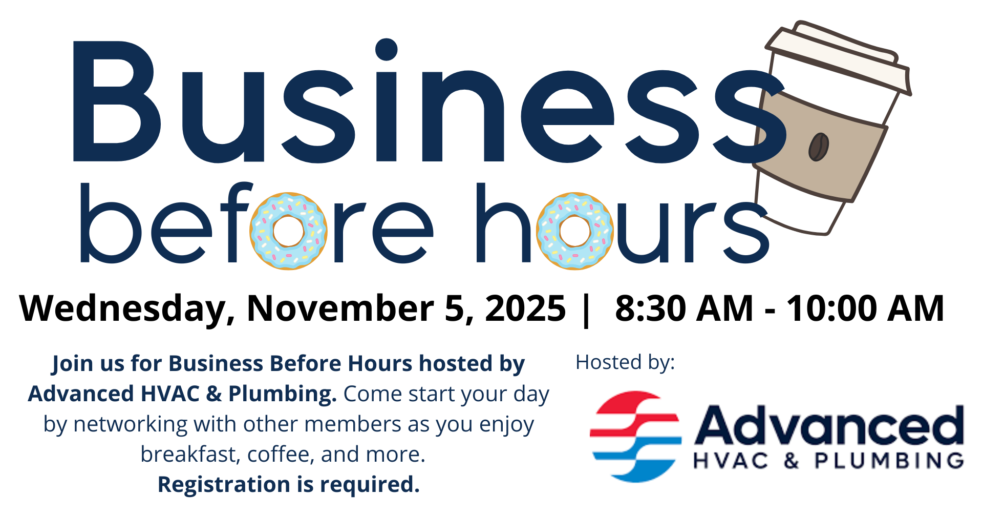 Join us for a Business Before Hours hosted by Advanced HVAC & Plumbing. Come start your day by networking with other members as you enjoy breakfast, coffee, and more. Registration is required.