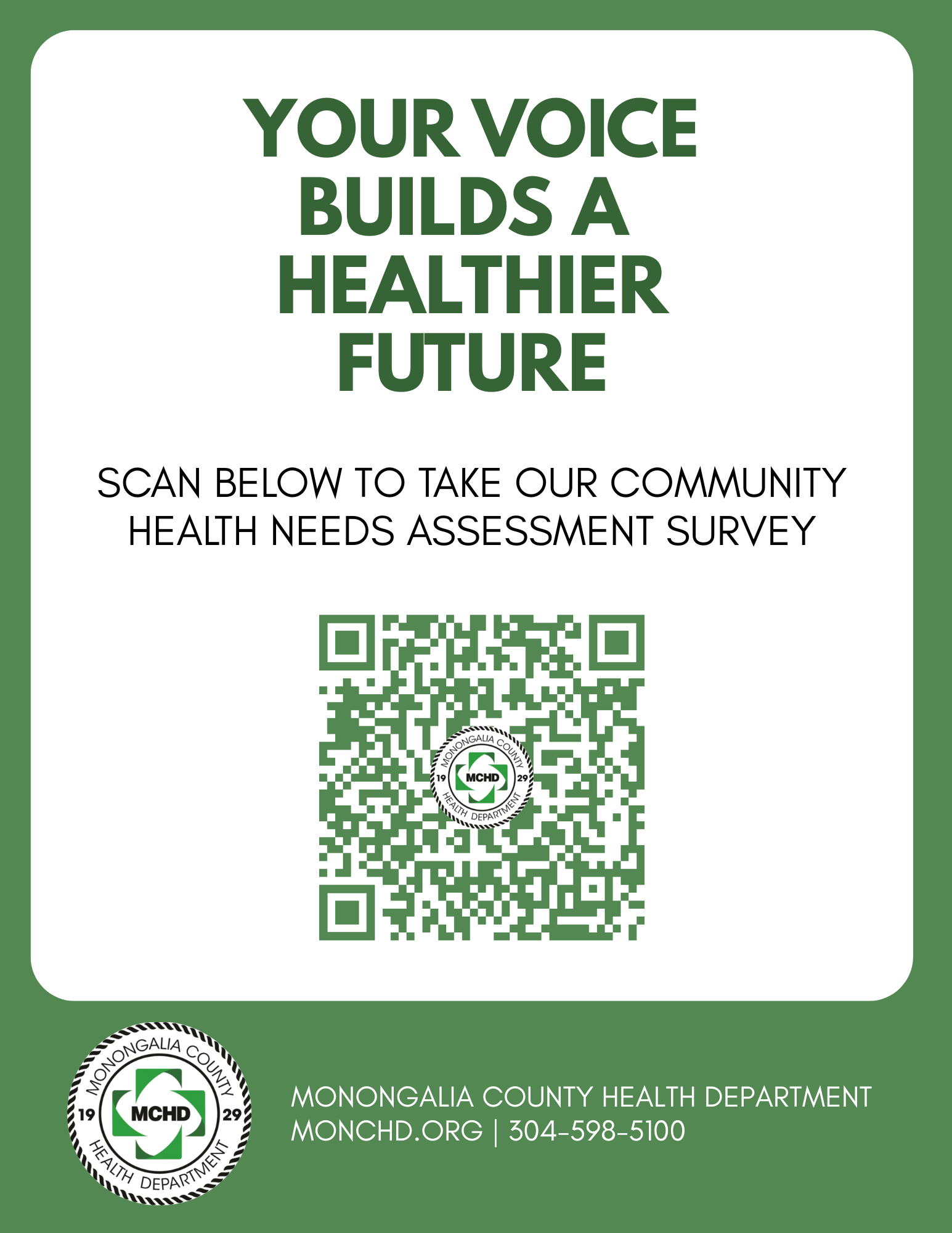 Your voice builds a healthier future! Please consider taking this three-minute, anonymous survey. Monongalia County Health Department conducts this Community Health Needs Assessment every three years. It helps us decide what programs to offer and who to partner with to make real community changes. Residents of Monongalia, Preston and Marion counties are eligible. Thanks for your help!