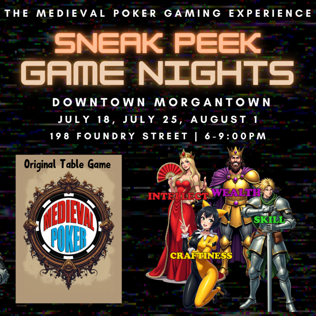 Join us from 6 - 9:00 pm as we give you a Sneak Peek at our new original table, Medieval Poker. Dave Thompson, our CEO and lead game designer, will teach you how to play and then you'll compete against three other players. First come, first serve..